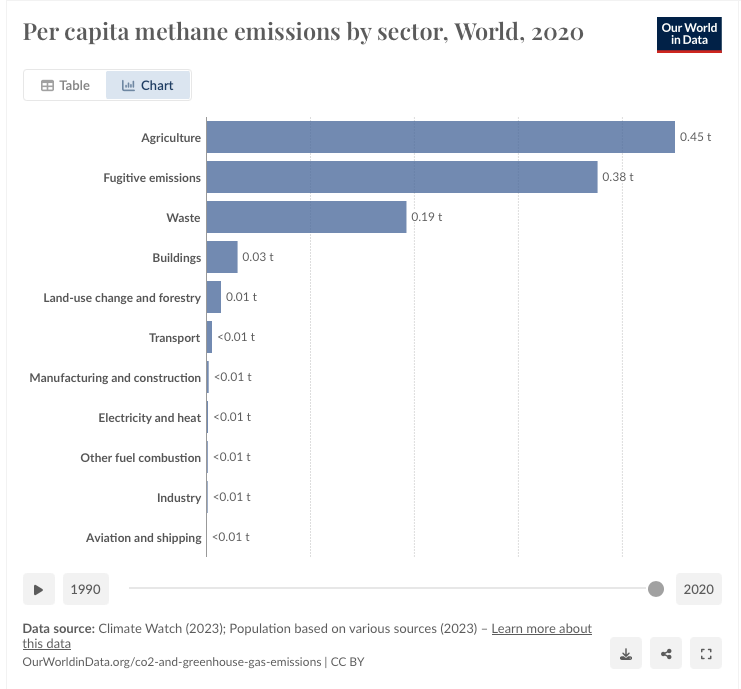In many conversations, methane emissions alone have been used as a sufficient argument for minimising livestock farming and red meat consumption. According to sources cited by Cowspiracy, methane is a dangerous greenhouse gas 86 times more potent and 25-100 times more destructive than CO2 over a 20 year time frame. And according to OurWorldinData again, agriculture accounts for the largest proportion of human-caused methane emissions on a per capita basis, with livestock being a significant contributor.