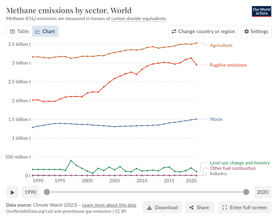 Despite the uncertainty, the overall trends from sources such as Our World in Data show that fugitive emissions from oil, gas and mining are the primary source of increased emissions.